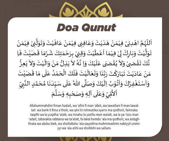 “Ya Allah, berilah aku petunjuk di antara orang-orang yang Engkau beri petunjuk, berilah kesejahteraan kepadaku di antara orang-orang yang Engkau beri kesejahteraan, tolonglah aku di antara orang-orang yang Engkau beri pertolongan, berikanlah keberkahan kepadaku atas apa yang Engkau berikan, dan peliharalah aku dari keburukan yang Engkau tetapkan. Sesungguhnya Engkau yang menetapkan dan tidak ada yang menetapkan atas-Mu. Tidak akan hina orang yang Engkau tolong. Maha Suci dan Maha Tinggi Engkau, wahai Tuhan kami.”