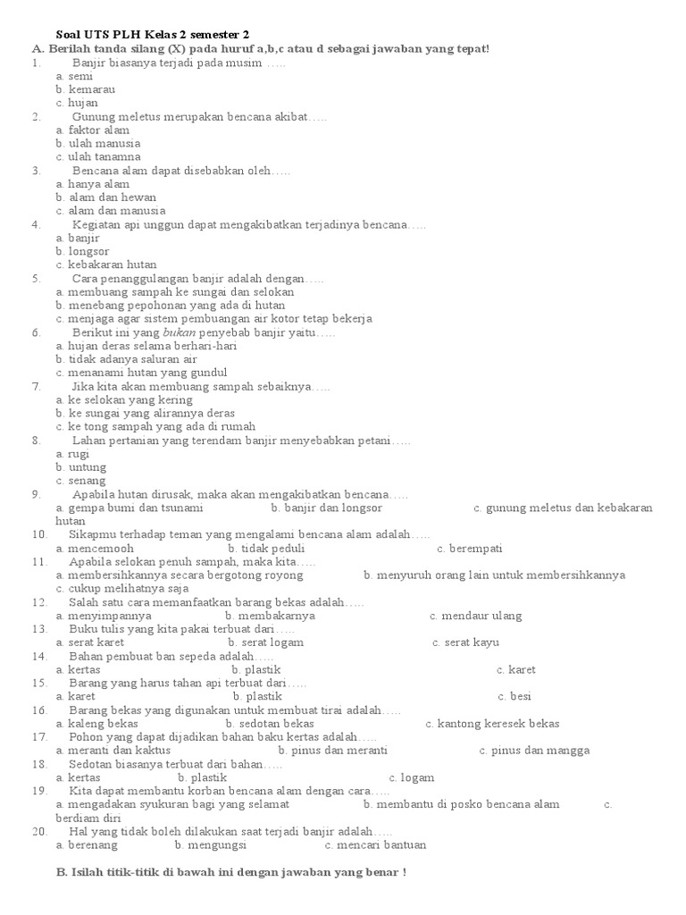 Mempersiapkan diri menghadapi ujian sekolah semester 2 membutuhkan persiapan yang matang dan tekun. Salah satu cara terbaik untuk mempersiapkan diri adalah dengan mengerjakan berbagai soal latihan. Dalam artikel ini, disajikan kumpulan soal ulangan dan ujian semester pelajaran Pendidikan Lingkungan Hidup (PLH) kelas 6 semester 2. Soal-soal ini tidak hanya membantu siswa dalam memahami materi, tetapi juga memberikan kunci jawaban yang bisa digunakan untuk mengoreksi hasil belajar.